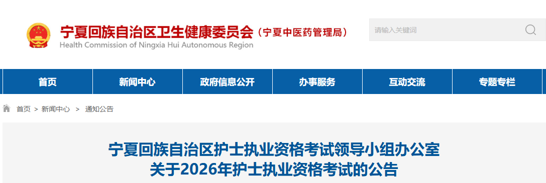 根據(jù)《全國護士執(zhí)業(yè)資格考試委員會辦公室關于2026年護士執(zhí)業(yè)資格考試有關問題的通知》(護考辦發(fā)〔2025〕4號)和《國家衛(wèi)生健康委人才交流服務中心關于2026年度護士執(zhí)業(yè)資格考試考務工作安排的通知》(衛(wèi)人才發(fā)〔2025〕75號)精神,現(xiàn)就做好寧夏考區(qū)2026年護士執(zhí)業(yè)資格考試有關事宜公告如下。