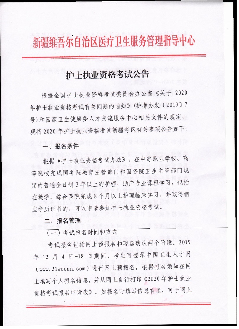 新疆2020年度護(hù)士執(zhí)業(yè)資格考試公告