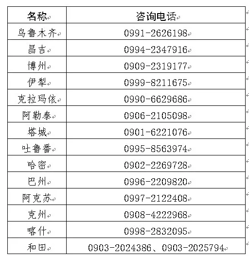 七、新疆考區(qū)護(hù)士執(zhí)業(yè)資格考試各考點(diǎn)咨詢電話
