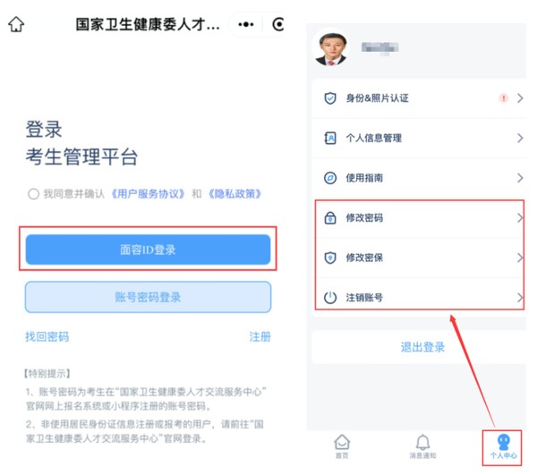 二、通過百度、微信、支付寶小程序端搜索國家衛(wèi)生健康委人才交流服務中心,進入后可通過面容識別登錄小程序,在“個人中心”可修改密碼找回問題、密碼或注銷賬戶: