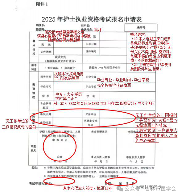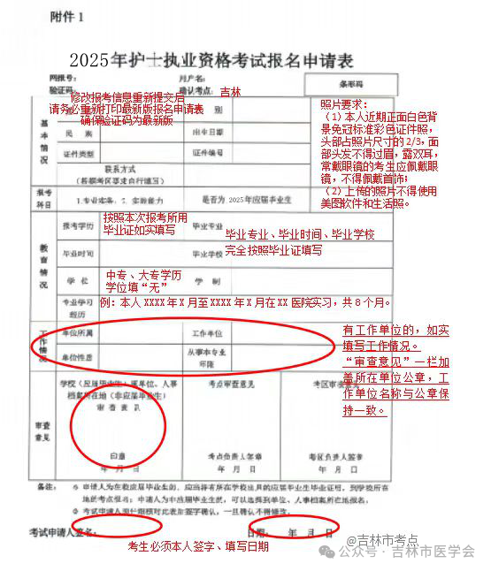 2024年12月3-16日期間,考生可登錄國家衛(wèi)生健康委人才交流服務中心官網(wǎng)(www.21wecan.com)進行網(wǎng)上預報名。考生登錄國家衛(wèi)生健康委人才交流服務中心官網(wǎng),進入護士執(zhí)業(yè)資格考試網(wǎng)上報名系統(tǒng),通過個人信息注冊,填報個人信息。具體步驟請參考《考生管理平臺注冊須知》(https://www.21wecan.com/wsrcw/c100196/202411/1002152.shtml),若密碼遺忘,請通過密保問題找回或登錄小程序端人臉識別找回。2.選擇考區(qū)、考點。考區(qū)統(tǒng)一選擇“吉林考區(qū)”,考點按屬地原則就近選擇。工作單位或檔案存放在吉林地區(qū)的考生選擇“吉林考點”。3.填報信息。填報信息由考生本人負責,考生應如實、準確填報考試信息。考生錯報姓名、證件號等相關(guān)考試信息,責任自負!4.上傳本人照片。考生須上傳近期6個月內(nèi)正面白色背景免冠彩色證件照照片。上傳的照片必須清晰并反映本人特征(雙胞胎人員請穿著不同顏色和樣式的衣服),不要過度修飾照片,質(zhì)量不合格的,考生須重新上傳。5.打印申報表??忌诰W(wǎng)上自行打印《2025年護士執(zhí)業(yè)資格考試報名申請表》。(1)考生修改報考信息重新提交后,請重新打印最新版報名申請表。(2)考生填報學歷學位信息保存后無法刪除,如發(fā)現(xiàn)有誤,可新增1條正確信息,在網(wǎng)上報名時引用正確信息即可。2.考生個體確認審核時間:12月12-13日、15-16日。具體時間:8:30-11:00 13:00-16:00吉林市船營區(qū)北京路156號中府大廈五樓,吉林市醫(yī)學會。乘車路線:1路、42路、52路、53路北大街站。本次現(xiàn)場審核采取“微信公眾號預約”形式。關(guān)注“吉林市醫(yī)學會”微信公眾號,現(xiàn)場確認及資格審核預約功能將于12月6日上午9時開放,請?zhí)崆邦A約并保存預約成功截圖,現(xiàn)場確認及資格審核當天向考點工作人員出示預約成功截圖后方可進入現(xiàn)場。1.經(jīng)所在單位(衛(wèi)生醫(yī)療機構(gòu))或檔案存放單位審核并加蓋公章的《2025年護士執(zhí)業(yè)資格考試報名申請表》1張(填寫說明見圖例1.1和1.2)(注:報名申請表填寫的工作單位名稱應和工作單位公章保持一致,蓋章要求為單位公章,而不是科室、處室或業(yè)務專用章);2.本人身份證原件、復印件各1份(要求將身份證正反面復印在同一張A4紙張的同一面,見圖例2);(1)???、本科畢業(yè)證:須在學信網(wǎng)打印《教育部學歷證書電子注冊備案表》(必須在有效期內(nèi))?!皩W信網(wǎng)”上如無法查詢到學歷信息,須提供吉林省大中專畢業(yè)生指導中心出具的《學歷認證報告書》;(2)吉林省中專畢業(yè)證:須打印學歷認證(吉林省中等職業(yè)學校畢業(yè)證認證網(wǎng)址http://renzheng.jlipedu.cn/cersys_web/)。5.本人臨床實習手冊或臨床實習8個月以上證明1份(式樣及填寫方式見附件1);特別提醒:申請人為在校應屆畢業(yè)生的,應當持有所在學校出具的應屆畢業(yè)生畢業(yè)證明(附件3),需加蓋學校公章,到學校所在地的考點報名。學??梢詾楸拘獙卯厴I(yè)生辦理集體報名。以上資料請整理后裝入自備的檔案袋內(nèi),并下載《吉林市考點2025年護士執(zhí)業(yè)資格考試考生信息表》(附件2),填寫完整后粘貼在檔案袋正面。圖例1.1:無工作單位的,報名申請表填寫說明