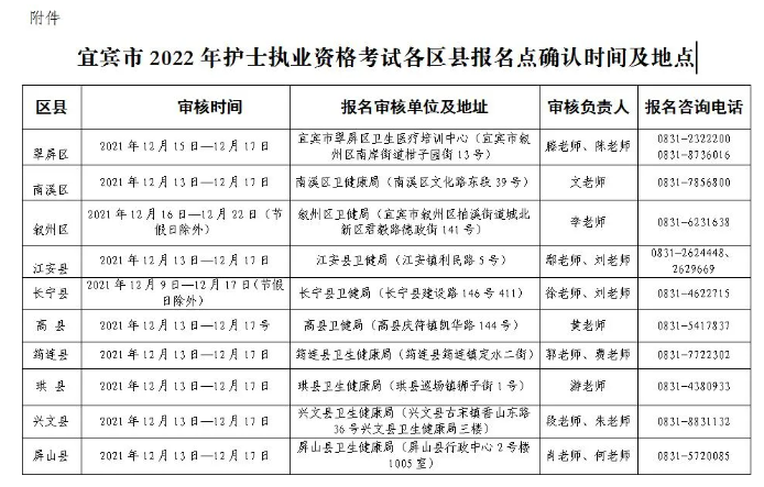 考生完成網(wǎng)上預報名后,必須攜帶報名申請表及相關證明材料(包括原件及復印件),在2021年12月9日-22日期間完成確認工作(各區(qū)縣衛(wèi)健局確認時間及地點見附件);區(qū)縣醫(yī)療衛(wèi)生機構報名人員應到所在區(qū)縣衛(wèi)健局進行資格審查和現(xiàn)場確認(市管民營醫(yī)療衛(wèi)生機構按屬地管理原則進行資格審查和現(xiàn)場確認,“三江新區(qū)”和“兩?!笔痉秴^(qū)的報名人員,由原來的屬地管理區(qū)縣進行資格審查和現(xiàn)場確認)。市直醫(yī)療衛(wèi)生單位報名人員由所在單位人事科經(jīng)辦人員按照報名要求審核蓋章,并在2021年12月19日以前將報名人員資料提交到宜賓市衛(wèi)生科教信息中心進行現(xiàn)場確認工作,不接受考生自行前往中心辦理審核確認工作;暫未就業(yè)且人事代理在市人才交流中心的報名人員現(xiàn)場確認請咨詢宜賓考點,咨詢電話0831-8211785。