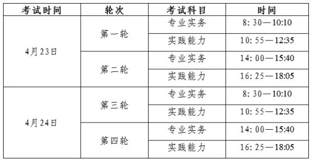 考試分為4輪次進(jìn)行,每半天為一個(gè)輪次,考生將隨機(jī)分配至其中一個(gè)輪次參加專業(yè)實(shí)務(wù)和實(shí)踐能力兩個(gè)科目的考試,具體考試時(shí)間以準(zhǔn)考證為準(zhǔn)。