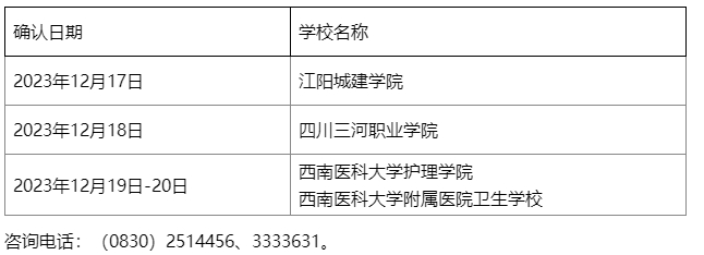 (二)2024年護(hù)理、助產(chǎn)專業(yè)應(yīng)屆畢業(yè)生由考生所在學(xué)校統(tǒng)一安排人員攜帶筆記本電腦和掃碼槍到瀘州市衛(wèi)生健康信息中心統(tǒng)一確認(rèn),務(wù)必確保在規(guī)定時(shí)間內(nèi)完成相關(guān)考生報(bào)名確認(rèn)工作,具體時(shí)間安排如下: