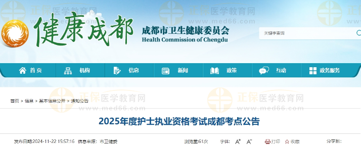 2025年度護(hù)士執(zhí)業(yè)資格考試成都考點(diǎn)公告公布啦!醫(yī)學(xué)教育網(wǎng)整理具體內(nèi)容如下:
