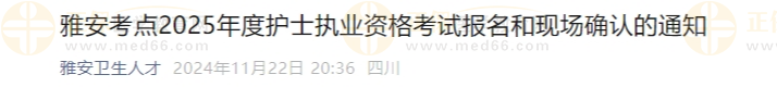雅安考點2025年度護士執(zhí)業(yè)資格考試報名和現(xiàn)場確認的通知公布啦!醫(yī)學教育網整理具體內容如下:
