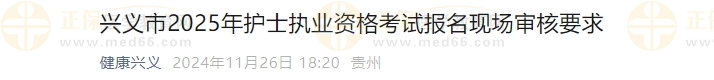 貴州興義市2025年護士執(zhí)業(yè)資格考試報名現(xiàn)場審核要求公布啦!醫(yī)學(xué)教育網(wǎng)整理具體內(nèi)容如下:
