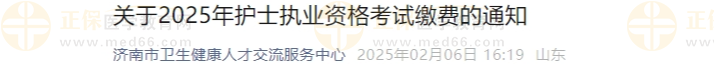 2025年護士執(zhí)業(yè)資格考試網(wǎng)上繳費日期為2月7日至16日,考試費用標準按照《山東省衛(wèi)生健康委員會關于明確醫(yī)師和護士執(zhí)業(yè)資格考試綜合筆試收費標準的通知》(魯衛(wèi)財字〔2020〕56號)執(zhí)行,即每人每科61元。請資格審核通過的考生及時登錄中國衛(wèi)生人才網(wǎng)繳費,逾期未繳費的考生視為放棄報考。 ??