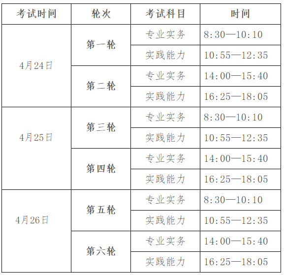 (二)考試時間:2021年4月24、25、26日三天,每半天為一個輪次,共分6輪次進行??忌鷮㈦S機分配至其中一個輪次參加考試。具體安排如下: