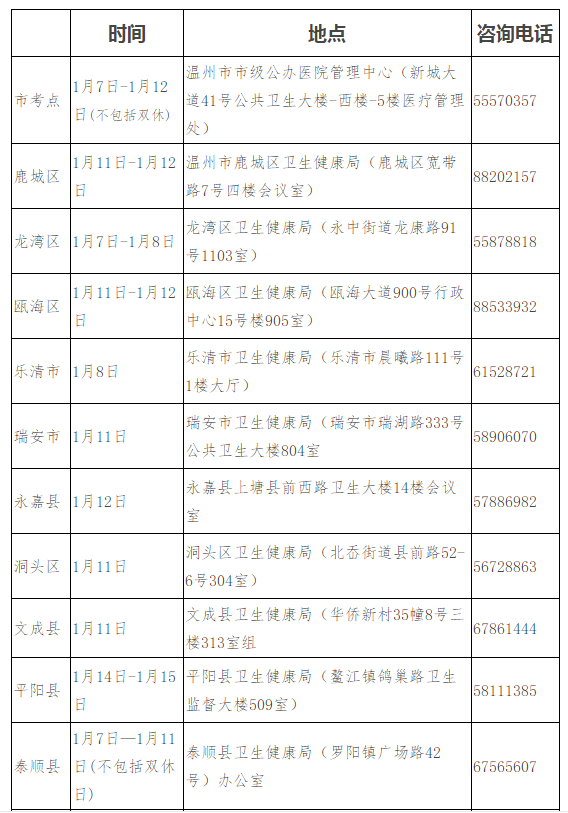 在溫省屬醫(yī)院、市屬醫(yī)療衛(wèi)生單位及市屬其他企事業(yè)單位報考人員由單位統(tǒng)一收集資料后到市考點報名確認;縣(市、區(qū))醫(yī)療衛(wèi)生單位和縣(市、區(qū))其他企事業(yè)單位報考人員到單位所在地的縣(市、區(qū))衛(wèi)生健康局報名確認(具體時間、地點如下)。
