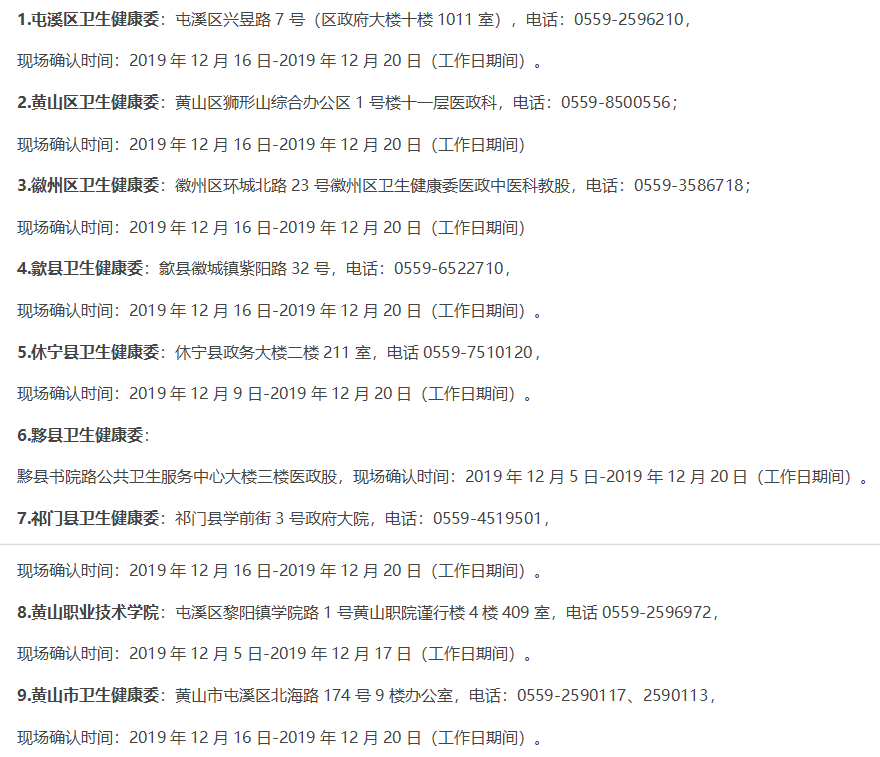 考生在網(wǎng)上報名后,須根據(jù)報名要求攜帶報名申請表及相關(guān)證件材料,到指定地點進行現(xiàn)場確認。各區(qū)縣報名考生至所在區(qū)縣報名點(設(shè)在各區(qū)縣衛(wèi)生健康委)進行現(xiàn)場確認,市直各醫(yī)療衛(wèi)生單位由單位負責人事管理的同志收集本單位報名材料后到市直報名點(設(shè)在市衛(wèi)生健康委)進行現(xiàn)場確認。黃山職業(yè)技術(shù)學院應(yīng)屆考生在黃山職業(yè)技術(shù)學院報名點進行現(xiàn)場確認,職院須將在校應(yīng)屆考生申報表和實習證明按招生大表順序一一對應(yīng)排列。