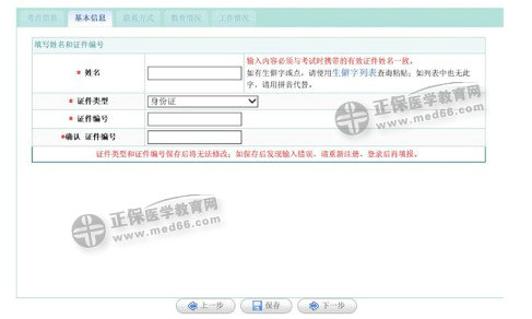 如系統(tǒng)提示“此證件編號(hào)已被其他人注冊(cè)”,考生須攜帶本人身份證前往當(dāng)?shù)氐目键c(diǎn)或報(bào)名點(diǎn)申請(qǐng)重新注冊(cè)報(bào)名。完成以上信息的填寫并核對(duì)無誤后,點(diǎn)擊“下一步”繼續(xù)填寫基本信息,該部分填寫內(nèi)容包括“性別”、“民族”、“證件有效期限”、“出生日期”、“健康狀況”、“國(guó)籍”,詳見下圖: