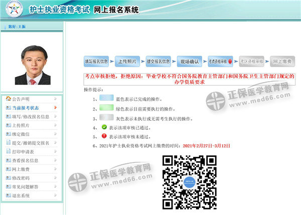 考點(diǎn)、考區(qū)資格審核工作結(jié)束后,考生可以登錄網(wǎng)上報(bào)名系統(tǒng),查看資格審核狀態(tài),被審核拒絕的考生可以查看拒絕原因。詳情見下圖顯示: