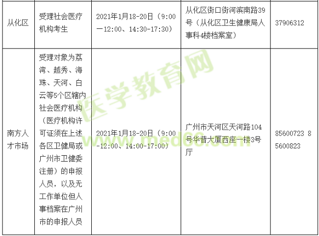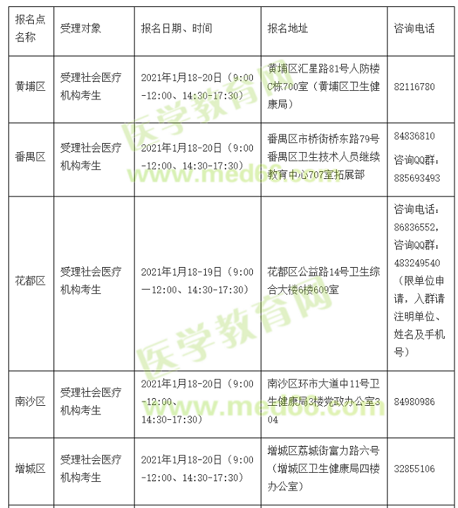 1.各區(qū)衛(wèi)健局報(bào)名點(diǎn):原則上受理屬下單位申報(bào)人員(單位含民營(yíng)社區(qū)衛(wèi)生服務(wù)中心,人員含在編和非在編人員)集體報(bào)名確認(rèn),各報(bào)名點(diǎn)可按實(shí)際情況選擇在2021年1月7-22日期間進(jìn)行現(xiàn)場(chǎng)確認(rèn)工作。花都、番禺、增城、從化、南沙、黃埔6個(gè)區(qū)衛(wèi)健局報(bào)名受理社會(huì)醫(yī)療機(jī)構(gòu)考生報(bào)名時(shí)間、地址及咨詢(xún)電話如下: