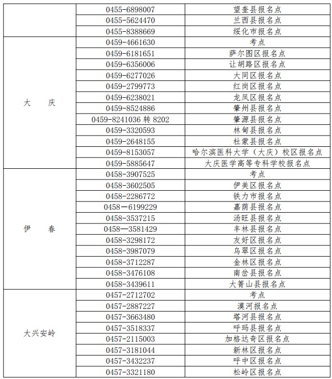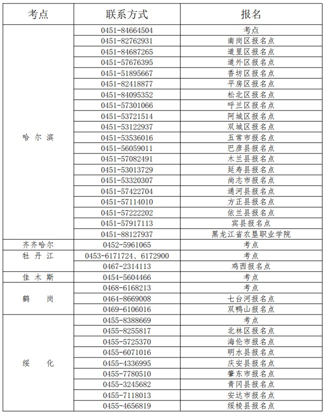 黑龍江考區(qū)2021年共設(shè)9個(gè)機(jī)考考試考點(diǎn):哈爾濱、齊齊哈爾、牡丹江、佳木斯、鶴崗、綏化、大慶、伊春和大興安嶺地區(qū),各考點(diǎn)負(fù)責(zé)承擔(dān)考試的考務(wù)考試工作。黑河市考生由齊齊哈爾考點(diǎn)負(fù)責(zé)考務(wù)考試工作;雞西市考生由牡丹江考點(diǎn)負(fù)責(zé)考務(wù)考試工作;雙鴨山市、七臺(tái)河市考生由鶴崗考點(diǎn)負(fù)責(zé)考務(wù)考試工作;農(nóng)墾、森工系統(tǒng)考生,按考生行政屬地化原則到屬地報(bào)名。為方便考生,未設(shè)考點(diǎn)的市地請(qǐng)按照考點(diǎn)的具體考務(wù)工作安排和要求,將本轄區(qū)考生的相應(yīng)材料集中報(bào)送到相對(duì)應(yīng)的考點(diǎn)考試管理機(jī)構(gòu)進(jìn)行審核。