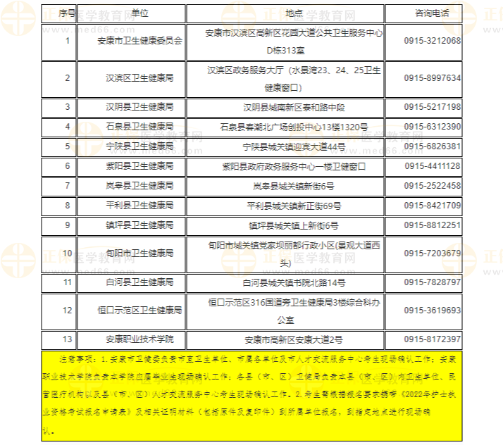 護(hù)士執(zhí)業(yè)資格考試實行屬地化管理,安康考點在10個縣(市、區(qū))、恒口示范區(qū),安康職業(yè)技術(shù)學(xué)院共13個地點均設(shè)報名審核點。各地根據(jù)實際情況,在2021年12月9日至22日期間,開展現(xiàn)場確認(rèn)及資格審核工作,具體安排情況,請電話咨詢各報名點。