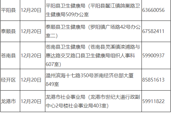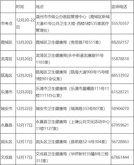 在溫省屬醫(yī)院、市屬醫(yī)療衛(wèi)生單位及市屬其他企事業(yè)單位報考人員由單位統(tǒng)一收集資料后到市考點報名確認;縣(市、區(qū))醫(yī)療衛(wèi)生單位和縣(市、區(qū))其他企事業(yè)單位報考人員到單位所在地的縣(市、區(qū))衛(wèi)生健康局報名確認(具體時間、地點如下)。