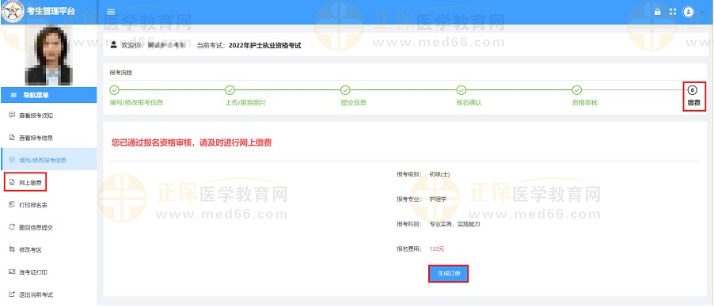 點(diǎn)擊報(bào)考流程上的“繳費(fèi)”節(jié)點(diǎn)或左側(cè)【網(wǎng)上繳費(fèi)】,核對(duì)報(bào)考專業(yè)科目和金額,確認(rèn)無誤后點(diǎn)擊“生成訂單”跳轉(zhuǎn)至考區(qū)指定的繳費(fèi)平臺(tái)。