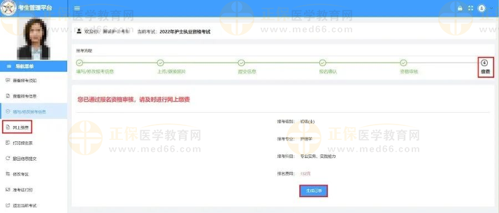 (二)點擊報考流程上的“繳費”節(jié)點或左側(cè)【網(wǎng)上繳費】,核對報考專業(yè)科目和金額,確認(rèn)無誤后點擊“生成訂單”跳轉(zhuǎn)至考區(qū)指定的繳費平臺。