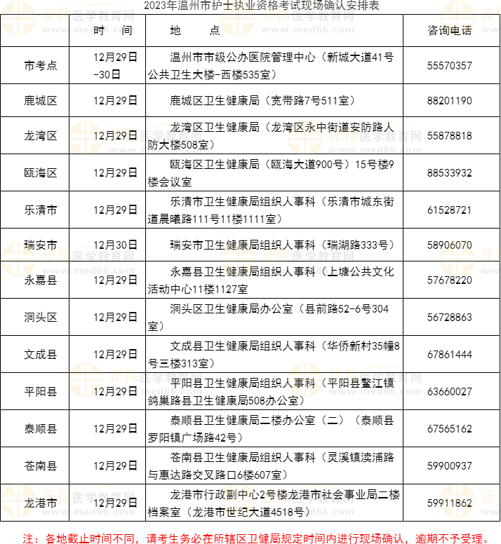 在溫省屬醫(yī)院、市屬醫(yī)療衛(wèi)生單位及市屬其他企事業(yè)單位報考人員由單位統(tǒng)一收集資料后到市考點報名確認(rèn);縣(市、區(qū))醫(yī)療衛(wèi)生單位和縣(市、區(qū))其他企事業(yè)單位報考人員到單位所在地的縣(市、區(qū))衛(wèi)生健康局報名確認(rèn)(具體時間、地點如下)。