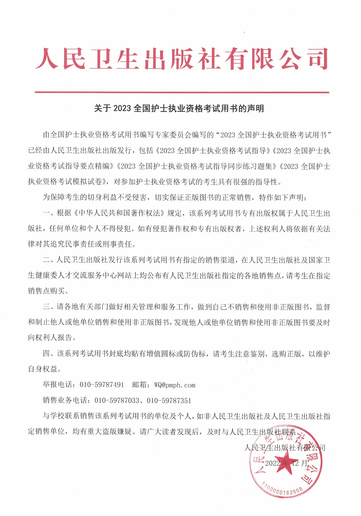 關(guān)于2023全國(guó)護(hù)士執(zhí)業(yè)資格考試用書(shū)的聲明