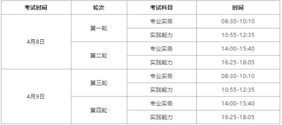 考試分為4輪次進(jìn)行,每半天為一個輪次,考生將隨機(jī)分配至其中一個輪次參加專業(yè)實務(wù)和實踐能力兩個科目的考試,具體考試時間以準(zhǔn)考證為準(zhǔn)。