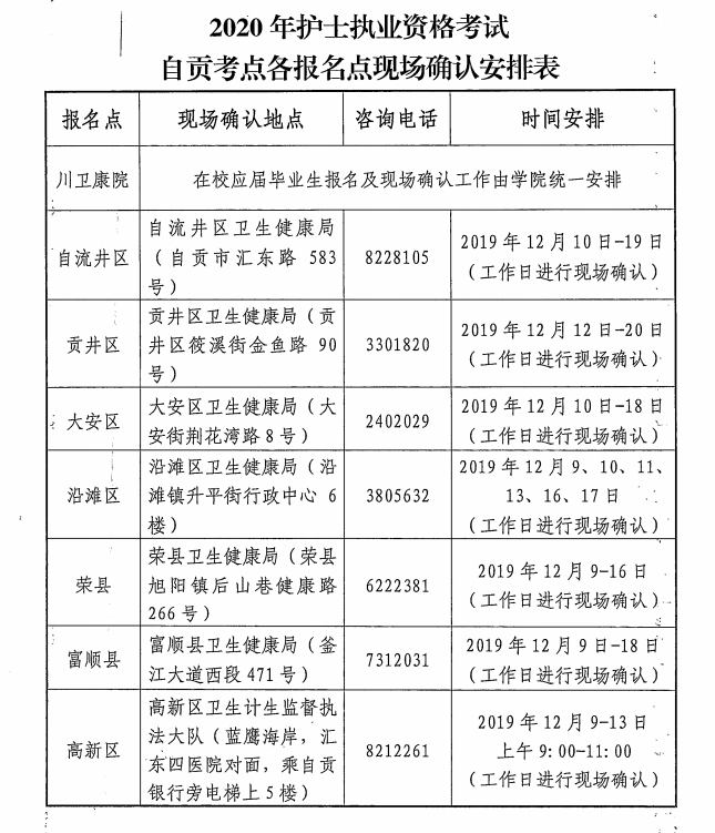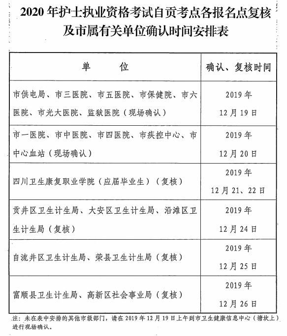 2020年護(hù)士執(zhí)業(yè)資格考試自貢考點(diǎn)各報(bào)名點(diǎn)復(fù)核及市屬有關(guān)單位確認(rèn)時(shí)間安排表