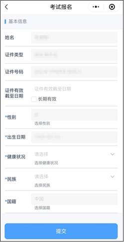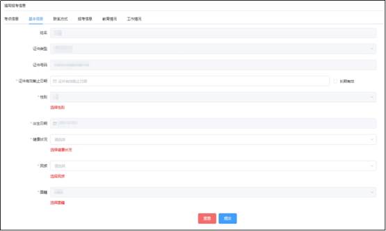 (2)基本信息會根據(jù)考生注冊時填寫的信息自動判斷引用,性別、出生日期如未引用,考生可手動選擇,民族和健康狀態(tài)請根據(jù)實際情況下拉選擇。