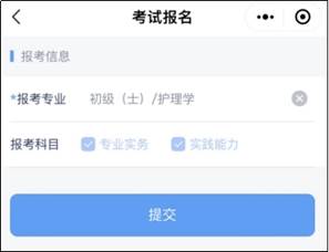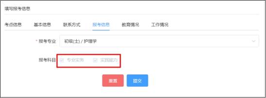 (4)“報考專業(yè)”選擇“初級(士)/護理學(xué)”,“報考科目”默認(rèn)勾選所有科目且不能修改。