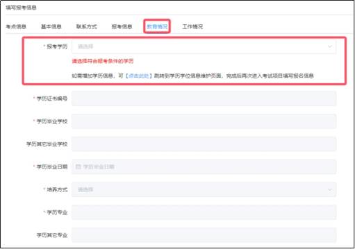 請選擇已維護的“學(xué)歷學(xué)位信息”。如需修改,請在學(xué)歷學(xué)位信息維護頁面進行操作,完成后再次進入考試項目填寫報名信息,引用正確的學(xué)歷和學(xué)位信息。