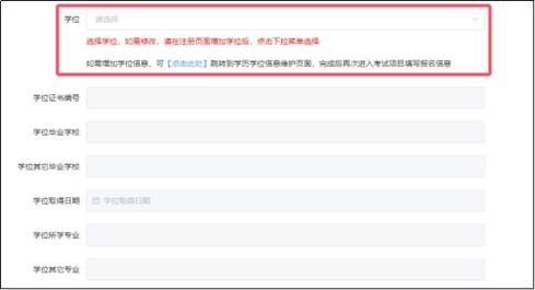 (5)報考學(xué)歷和學(xué)位相關(guān)信息下拉選擇,引用基本信息中【學(xué)歷學(xué)位信息維護】的內(nèi)容。如需修改,請在學(xué)歷學(xué)位信息維護頁面進行操作,完成后再次進入考試項目填寫報名信息,引用正確的學(xué)歷和學(xué)位信息。