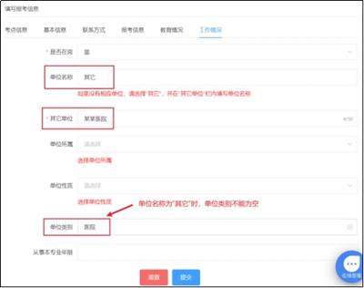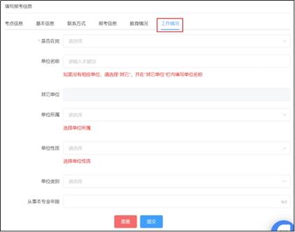 “是否在崗”如選擇“否”,則無需填寫其它信息;如選擇“是”,須如實填寫“單位名稱”、“單位所屬”、“單位性質(zhì)”、“單位類別”和“從事本專業(yè)年限”。