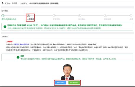 (7)以上信息提交后,系統(tǒng)會自動跳轉(zhuǎn)至上傳照片頁面,也可點擊【報考流程】中的“上傳照片”節(jié)點,進入功能區(qū)上傳照片。默認(rèn)引用注冊照片,如無需修改,點擊“確認(rèn)使用照片”;如需更換照片,下載照片審核處理工具對新照片處理后點擊“更換考試照片”,選擇處理后的新照片即可。