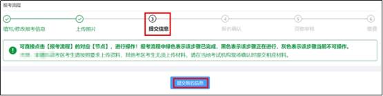 (8)上傳照片后系統(tǒng)將跳轉(zhuǎn)至【提交報名信息】頁,考生也可點擊【報考流程】中的“提交信息”節(jié)點,確認(rèn)無誤后點擊“提交報名信息”。