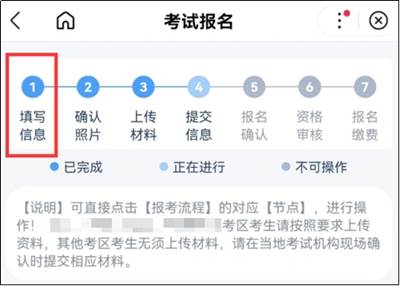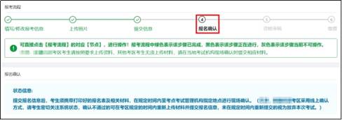 提交報名信息后,考生須按照當(dāng)?shù)乜荚嚬芾頇C構(gòu)的要求,在規(guī)定的時間內(nèi),攜帶報名表和相關(guān)材料前往指定地點進行報名確認(rèn)。經(jīng)報名點或考點確認(rèn)報名信息后,“報名確認(rèn)”節(jié)點變?yōu)榫G色。