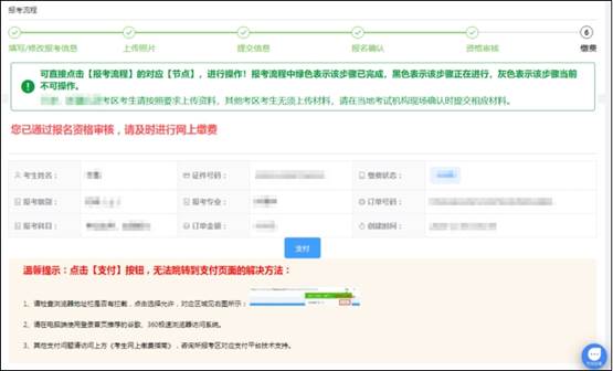 點擊報考流程中的【繳費】節(jié)點,核對報考專業(yè)科目和金額,確認(rèn)無誤后,點擊“支付”按鈕跳轉(zhuǎn)至考區(qū)指定的繳費平臺進行支付。完成繳費后【繳費】節(jié)點變?yōu)榫G色,表示報名成功。