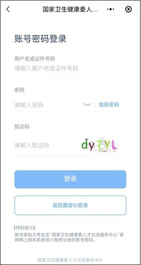 打開百度、微信客戶端,搜索“國家衛(wèi)生健康委人才交流服務(wù)中心”小程序,進入考生管理平臺登錄界面。