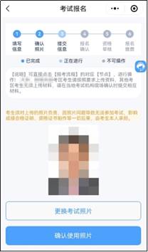 5.報名信息填寫完成后進入確認(rèn)照片。默認(rèn)引用注冊照片,如無需修改,點擊“確認(rèn)使用照片”;如需更換照片,點擊“更換考試照片”,上傳符合要求的照片。
