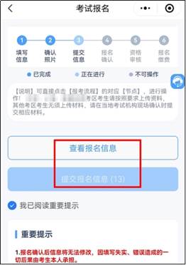 6.確認(rèn)照片后將跳轉(zhuǎn)至【提交報名信息】頁,考生可點擊“查看報名信息”進行信息核查。確認(rèn)無誤后,回到報考流程中的【提交信息】節(jié)點,點擊“提交報名信息”。