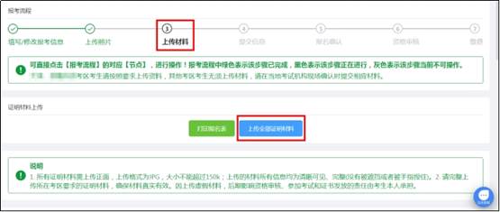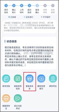 填寫信息完成后,系統(tǒng)將跳轉(zhuǎn)至【上傳材料】節(jié)點,進入上傳材料頁面??忌上赛c擊“查看報名表”,下載并“打印報名申請表”,然后按照考區(qū)的要求上傳相關(guān)證明材料。