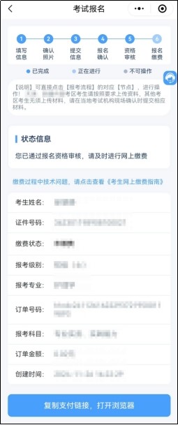 完成繳費后【繳費】節(jié)點變?yōu)樯钏{色,表示報名成功。