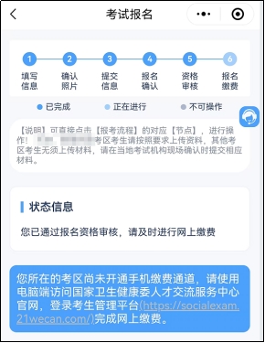 如所在考區(qū)尚未開通手機繳費通道,系統(tǒng)會提示考生使用電腦端登錄考生管理平臺完成網(wǎng)上繳費。