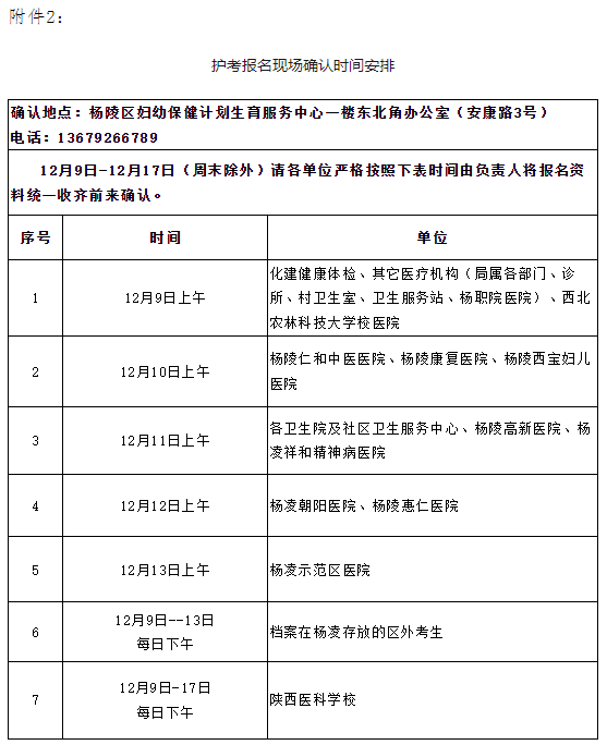 3、現(xiàn)場確認方式:考生將以上報名資料整理完畢交由所屬單位負責(zé)人統(tǒng)一收集,各單位認真填寫報名登記表與考生報名資料一并報送至楊陵區(qū)婦幼保健計劃生育服務(wù)中心一樓辦公室(安康路3號)進行確認。應(yīng)屆畢業(yè)生由學(xué)校持招生審批表并統(tǒng)一收齊考生報名材料前來現(xiàn)場確認。咨詢電話:13679266789