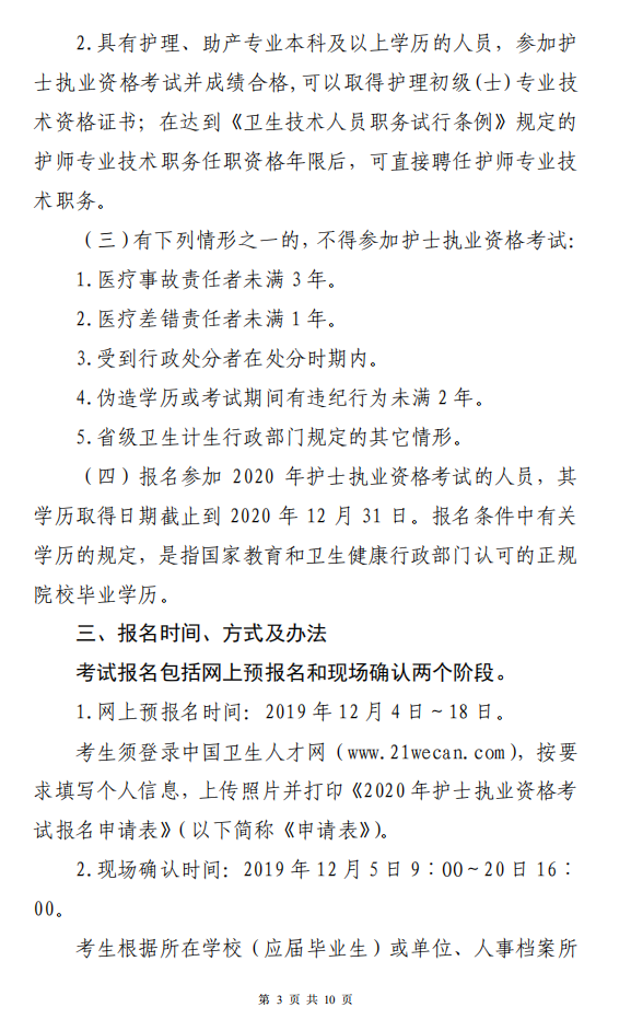 1:網(wǎng)上預(yù)報名時間:2019年12月4-12月18日期間,登錄中國衛(wèi)生人才網(wǎng)(www.21wecan.com)進行網(wǎng)上預(yù)報名,根據(jù)報名須知在網(wǎng)上填寫個人報名信息,并從網(wǎng)上自行打印《2020年護士執(zhí)業(yè)資格考試報名申請表》。