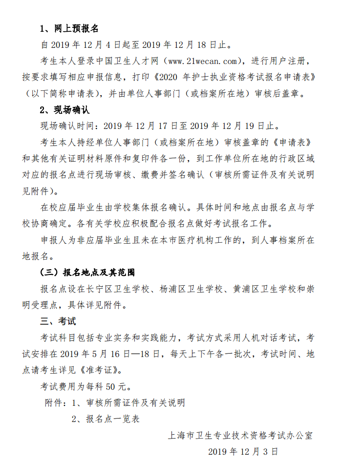 1、 網(wǎng)上預(yù)報名時間:2019年12月4日-12月18日期間,登錄中國衛(wèi)生人才網(wǎng)(www.21wecan.com)進(jìn)行網(wǎng)上預(yù)報名,根據(jù)報名須知在網(wǎng)上填寫個人報名信息,并從網(wǎng)上自行打印《2020年護(hù)士執(zhí)業(yè)資格考試報名申請表》。
