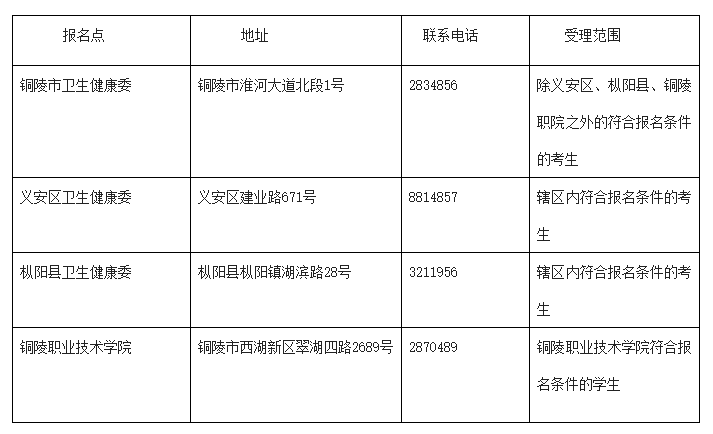現(xiàn)場確認(rèn):為進(jìn)一步加強(qiáng)考試工作管理,方便廣大考生報(bào)名,銅陵考點(diǎn)共設(shè)4個報(bào)名點(diǎn),負(fù)責(zé)考生報(bào)名及現(xiàn)場確認(rèn)工作。各報(bào)名點(diǎn)考試管理機(jī)構(gòu)根據(jù)具體情況選擇在2019年12月5-20日期間進(jìn)行現(xiàn)場確認(rèn)工作??忌毟鶕?jù)報(bào)名要求攜帶報(bào)名申請表(附件1)及相關(guān)的證件材料(包括原件和復(fù)印件),到指定地點(diǎn)進(jìn)行現(xiàn)場確認(rèn)和審核。銅陵報(bào)名點(diǎn)具體如下:
