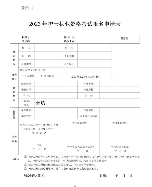 1.《2023年護(hù)士執(zhí)業(yè)資格考試報(bào)名申請(qǐng)表》(附件1)一式兩份(一份考生用于考試確認(rèn),一份各考點(diǎn)留檔備查);