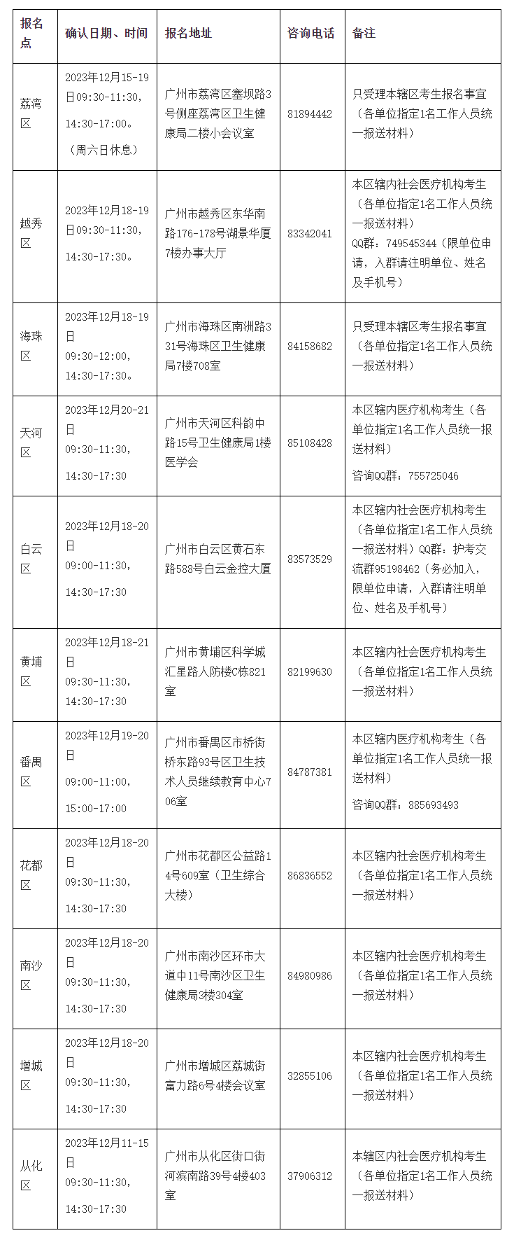 各區(qū)衛(wèi)健局報(bào)名點(diǎn):原則上受理屬下單位報(bào)考人員集體報(bào)名確認(rèn)及轄區(qū)內(nèi)的社會(huì)報(bào)考人員(工作單位或人事檔案所在地在本轄區(qū)內(nèi))的報(bào)名確認(rèn)。受理確認(rèn)時(shí)間、地點(diǎn)和受理方式由各區(qū)根據(jù)實(shí)際情況自行確定。具體受理社會(huì)報(bào)考人員的現(xiàn)場(chǎng)確認(rèn)時(shí)間、地點(diǎn)及咨詢電話匯總?cè)缦拢?/p>