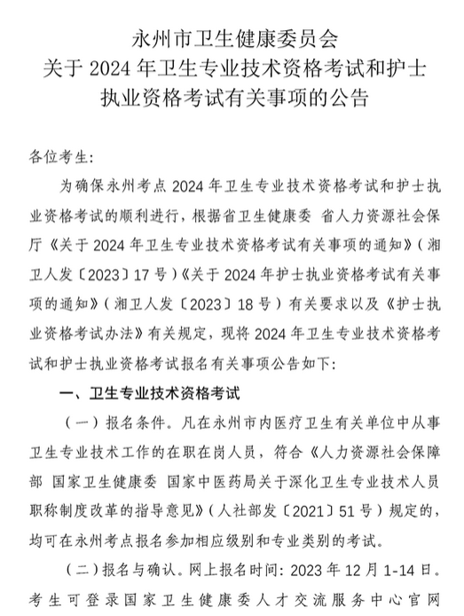 湖南省永州市2024年護(hù)士執(zhí)業(yè)資格考試公告
