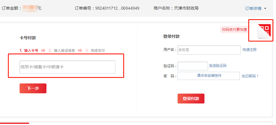 4.1跳轉到銀聯(lián)支付頁面后可以選擇左邊輸入銀行卡號支付,也可以點擊右上角后用銀行卡云閃付APP掃描支付